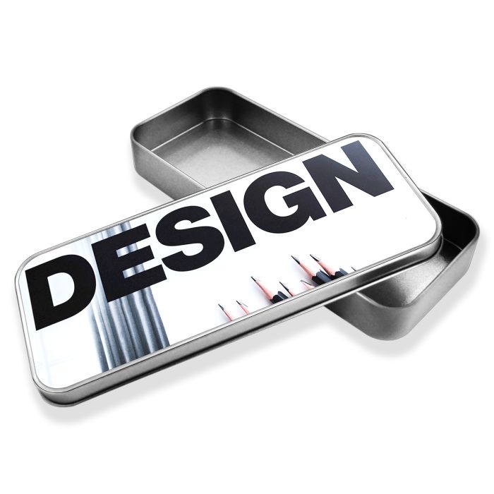 Boîte, plumier métal personnalisé sur le haut du couvercle, avec une photo, un texte, en couleurs ou en noir et blanc. De forme rectangulaire.
