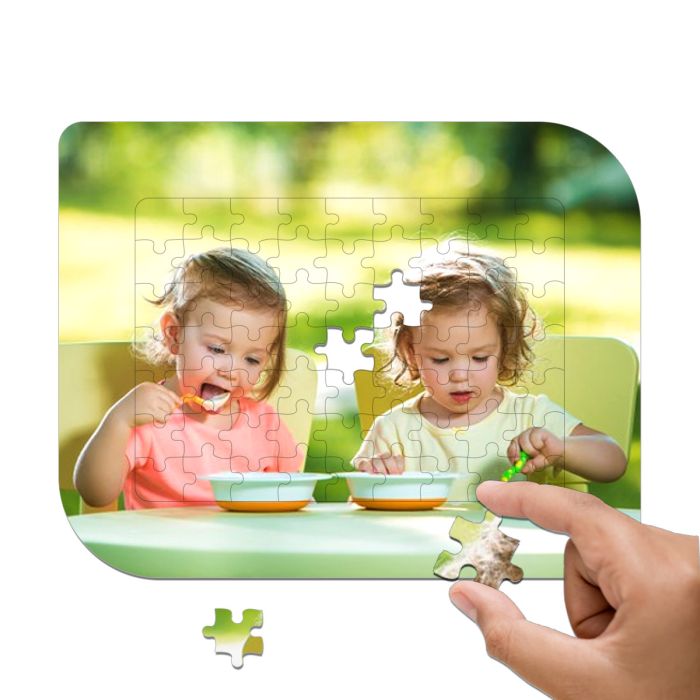 Puzzle personnalisé de 63 pièces sur son cadre. Chassis rectangulaire avec 2 bords arrondis en carton. Au dos ce trouve un système pour le maintenir verticalement sur une surface. La zone rectangulaire des pièces du puzzle fait 180 mmx 130 mm mais la zone personnalisée avec une photo et/ou un texte fait est a fond perdu sur 235mm x 195mm. Ce cadre s'orientera aussi bien à l'horizontal qu'à la verticale.
